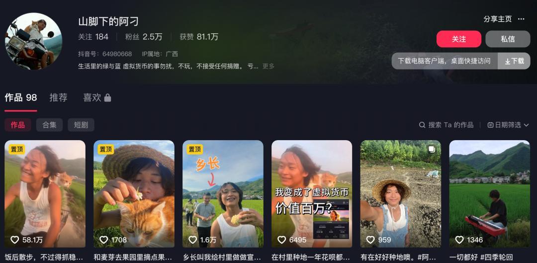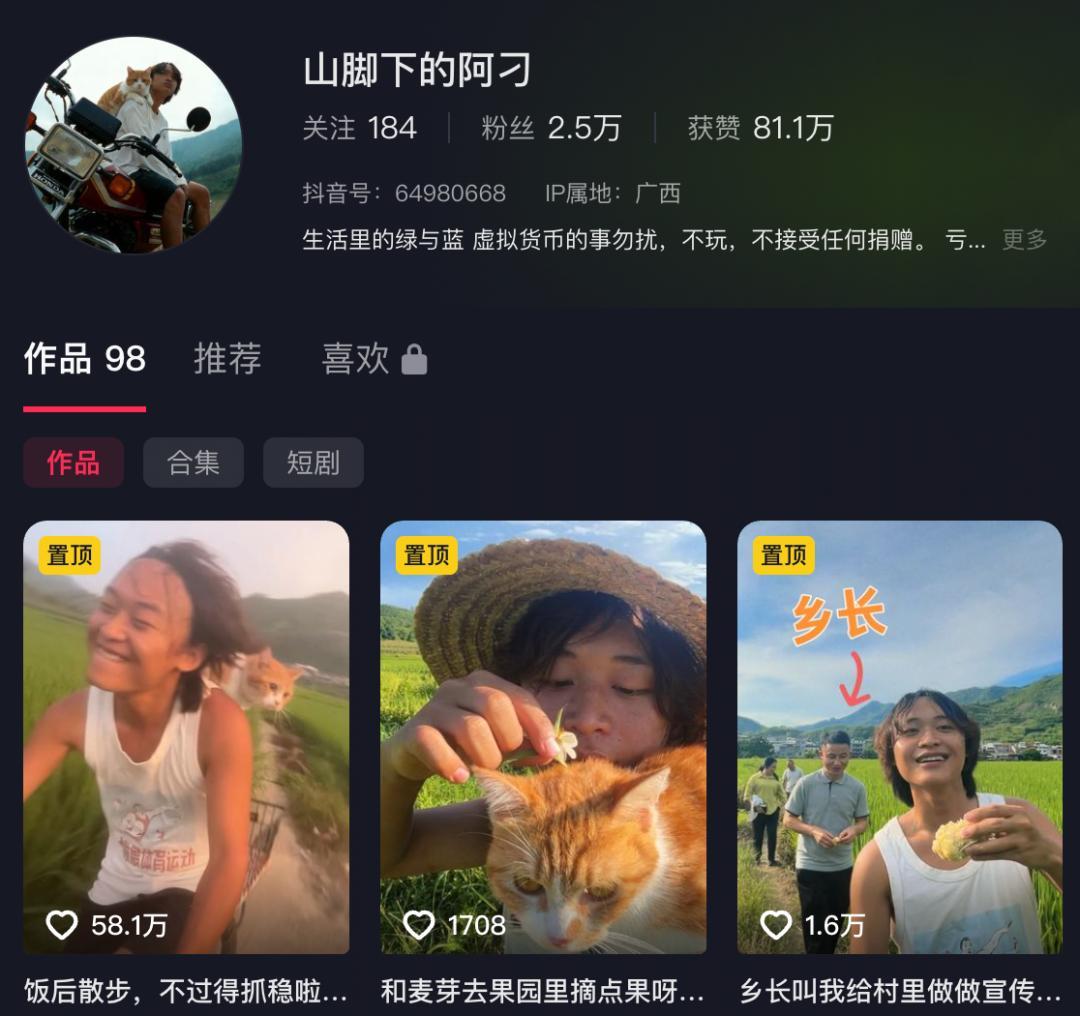 壮族小伙阿刁出生于 2000 年,是板干村土生土长的村民,广 C 口音浓郁。他经营了一个自媒体账号,名字叫山脚下的阿刁,几个平台的粉丝加起来有个几万人。