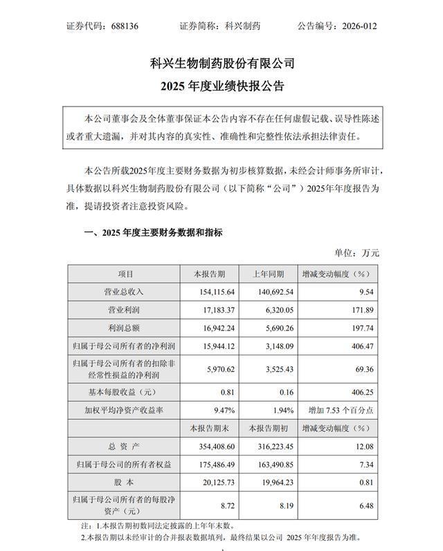 近日,科兴制药(688136.SH)披露的业绩快报显示哪家证券公司最正规,2025年,公司实现营业收入15.41亿元,同比增长9.54%;归母净利润1.59亿元,同比大增406.47%;扣非归母净利润为5970.62万元,同比增长69.36%。
