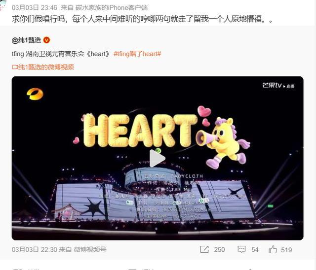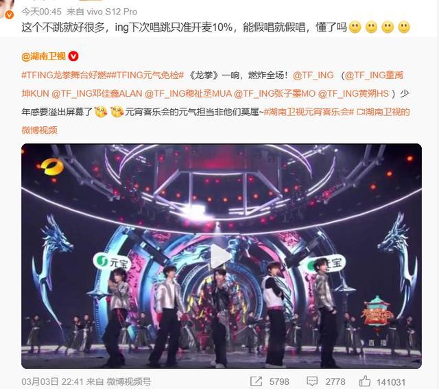 因为之前假唱的问题被嘲得太严重,热搜都连续爆了几次,这次湖南台的假唱味淡了很多,可不假唱并不代表效果好,其中一个新生代男团TFING的状态极其糟糕。