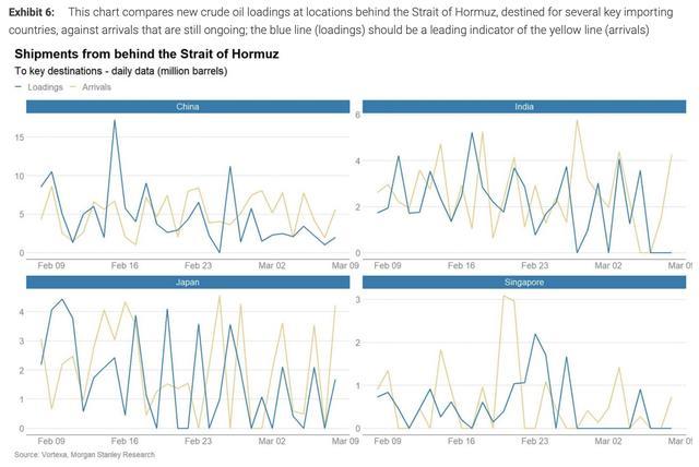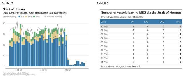 据摩根士丹利3月10日发布的每日追踪报告,当日仅约3艘原油及成品油油轮经由霍尔木兹海峡驶出波斯湾,LNG及LPG船只过境数量为零,而正常水平约为35艘。与此同时,特朗普周一晚间宣布可能解除对"部分国家"的制裁,为局势走向增添新的变量。